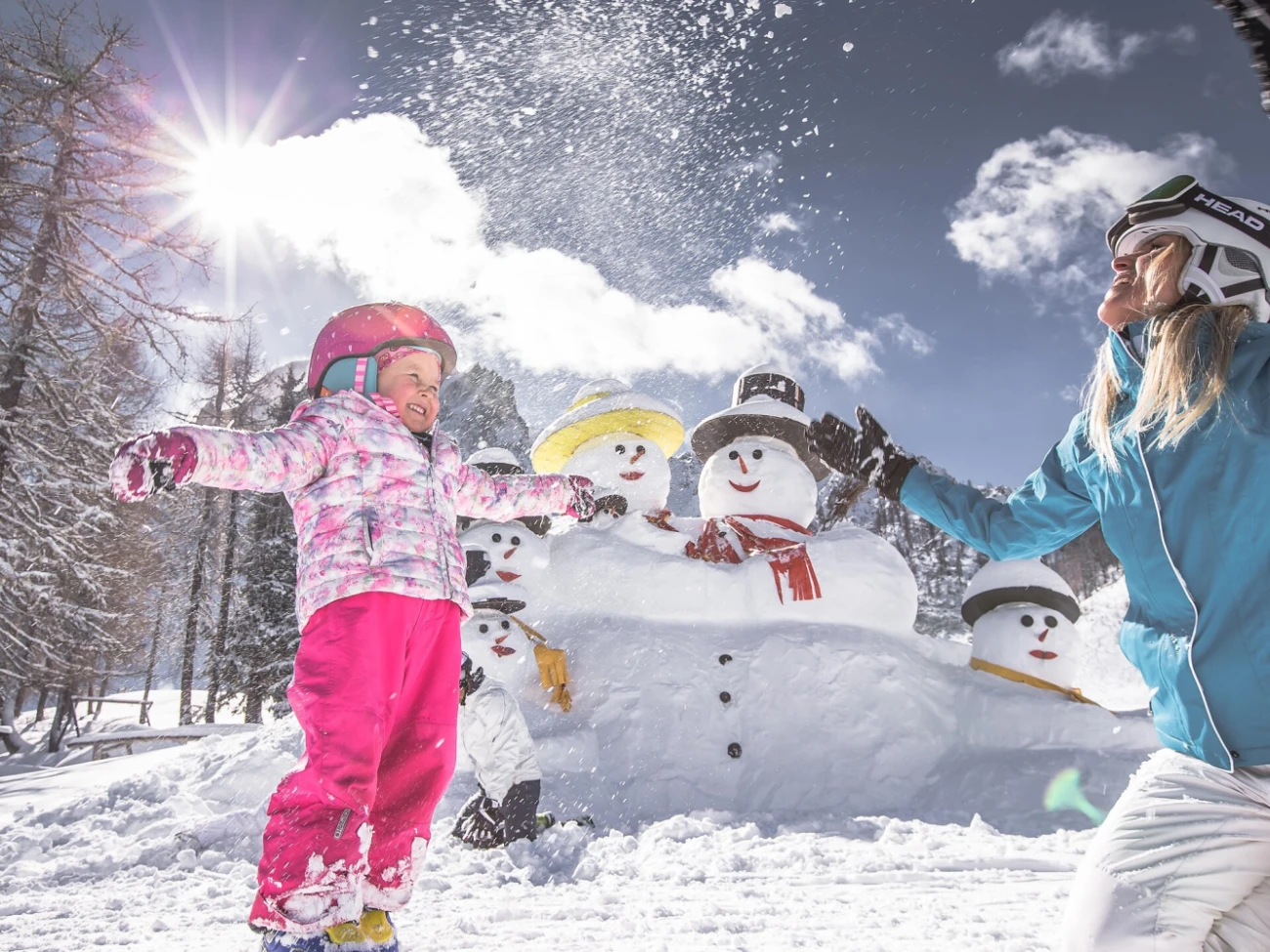 Giganteschi, bianchi e con un sorriso gentile sul viso - così ti accoglieranno i pupazzi di neve giganti nel mondo invernale da favola alla stazione a monte della Croda Rossa nel comprensorio sciistico 3 Cime Dolomiti. Davanti alle maestose e imponenti vette delle Dolomiti la famiglia di pupazzi di neve sembra minuscola e solo quando ci passi accanto sciando, ti accorgi delle sue vere dimensioni.