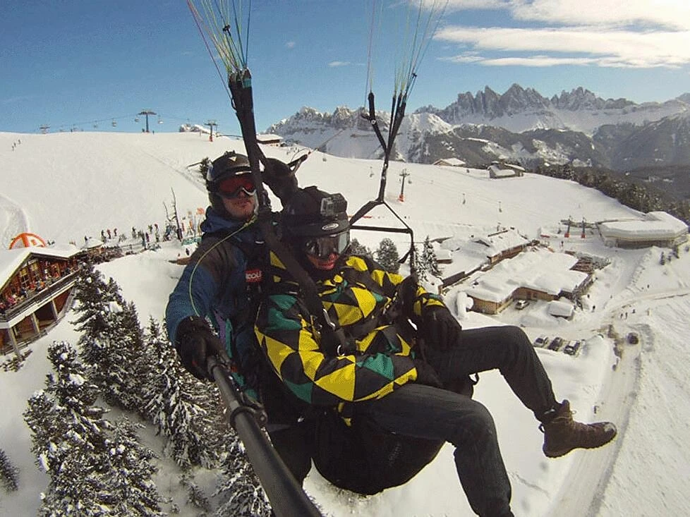 Un volo tandem con un parapendio è un’avventura indimenticabile tra le meravigliose montagne dell’Alto Adige. Scoprite un’indescrivibile sensazione di leggerezza quando dopo una breve corsa il vento solleva il parapendio in aria. Come un uccello con le ali spiegate volerete sopra verdi pascoli, piccoli villaggi di montagna e boschi profondi. Il mondo è ai vostri piedi e solo il dolce fruscio del vento rompe il silenzio maestoso durante il volo. Nel corso di un volo tandem in parapendio potrete ammirare una fantastica vista panoramica con vette aspre e valli profonde. Sopra di loro il parapendio colorato si inarca di fronte ad un cielo azzurro e passa accanto a nuvole bianche. Vivrete momenti davvero unici, ammirando le montagne altoatesine dal cielo e scoprirete la sensazione indescrivibile di libertà sconfinata.
