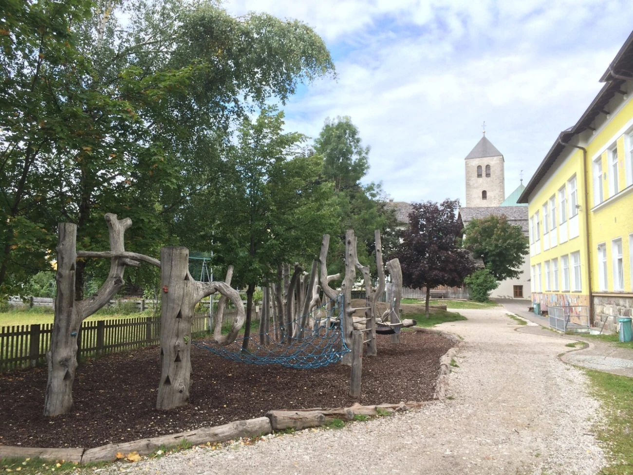 Parco giochi presso la scuola elementare con campetto, arrampicata per bambini, sabbiera, ecc.